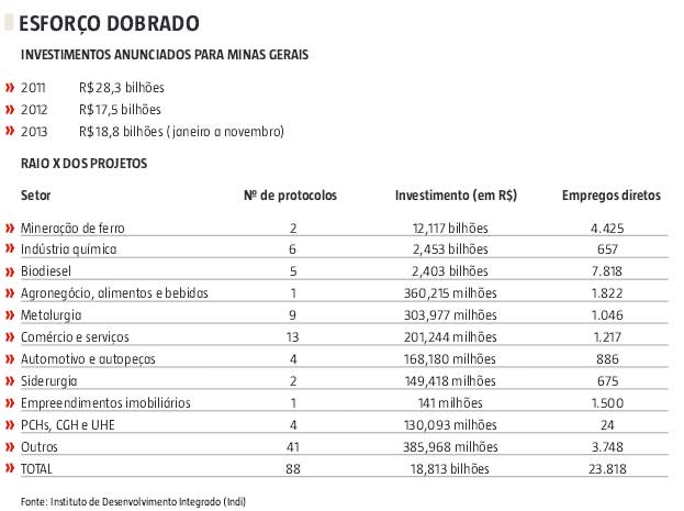Com o fraco desempenho da economia brasileira em 2013, o setor privado manteve a cautela na definição de investimentos pelo segundo ano. Em Minas Gerais, somaram R$ 18,8 bilhões os 88 acordos firmados entre a indústria, o comércio e as empresas prestadoras de serviços com o governo estadual para a implementação de projetos de novas instalações ou expansões. O número de protocolos de intenção de investimentos caiu quase 46%, comparado aos 165 documentos assinados em 2012, mas, graças aos recursos tradicionalmente vultosos da indústria da mineração, a cifra total anunciada superou em 7,4% o bolo do ano passado. Nos dois períodos, o fôlego da iniciativa privada ficou bem aquém dos R$ 28,3 bilhões que o estado atraiu em 2011.